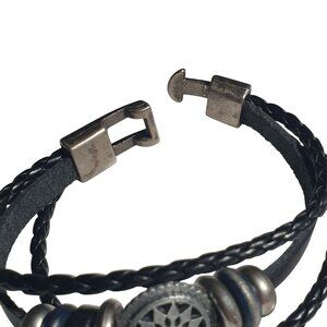 Braided Black Leather Bracelet Silver Wheel Charm Clasp Adjustable Jewelry Men