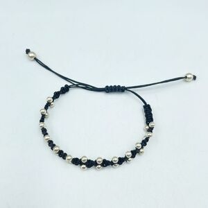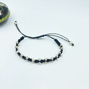 The silver tone beads and sliding closure add a touch of sophistication to the black thread bracelet.