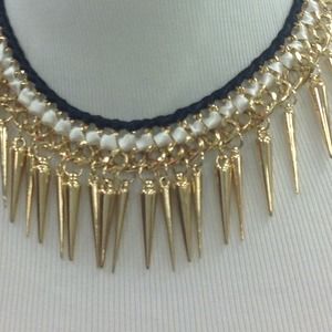 Glam statement necklace featuring braided curb chain and edgy spike details. Dress it up with a peplum top and pencil skirt or dress it down with a plain white tee and skinnies. Please ask us if you have any questions!