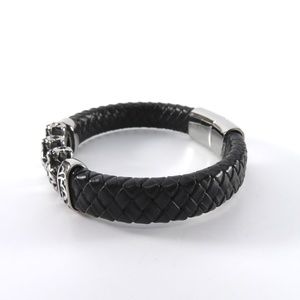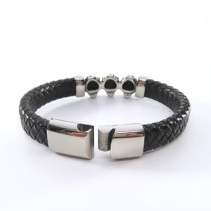 Braided leather bracelet with cheetah heads in stainless steel. It’s an oval for a better fit and is 2 7/8” x 2 18” across and about 5/8” wide. The inside dimension is 7 1/2”. The clasp has an usual design where a rod slides into a hole on the opposite end. I’ve tried to show it in the last 2 photos.