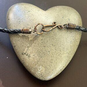 Unisex Minimalist Boho Ruby Red Czech glass bead with Gold-washed Lotus nestled in an intriguing antiqued brass open back crown bezel. The pendant is suspended with a hand-forged wire-wrapped bail on a braided genuine leather cord. The necklace is finished with hand-forged, wire-wrapped ends and hook closure. This piece is one-of-a-kind.