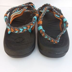 Step out in style with these vibrant braided sandals. Featuring a mix of blue, orange, and black, these shoes are perfect for any casual outing.