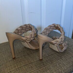 These trendy neutral beige colored heels are sure to wow. They have a square toe, very stylish and are sky high. Only worn once, very sexy.
