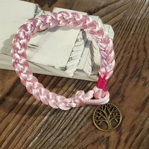 Braided Pale Pink Silk Antique Brass Tree of Life Charm Button Bracelet