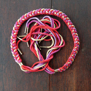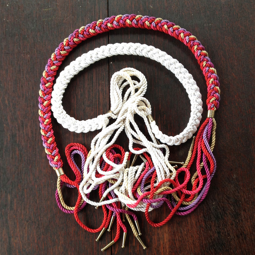 Fancy braided long tasseled sashes. One is all white with gold tipped tassels, the other is red, purple and gold with gold tipped tassels. Both are 58" long and in great condition. These were used in Wicca rituals but have many applications... let your imagination be your guide! (Halloween is coming!)