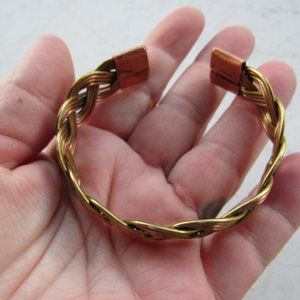 In good condition, this pretty cuff bracelets fits a normal size wrist and is adjustable. It is 5/8" wide. Made of copper and metal.