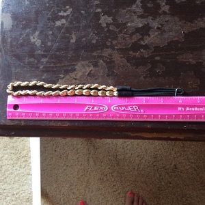 This chain has a soft fabric braided with a gold chain secured together with elastic to create a braided headband. It fits very comfortably. It has been worn only twice. The chain is 13 inches and the elastic is about 6 1/2 inches long