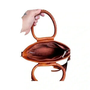 Braided top handle small tote, inside zip & back pocket, crossbody strap, brown NWT