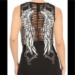 Deep braided V-neck angel wing embellished in rhinestones with a detailed low spine detailed braid down the back