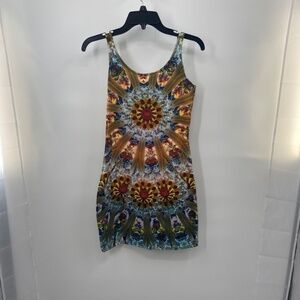 Very unique pattern sleeveless dress Bust 15” Length 32” See pic for material content Gently Worn