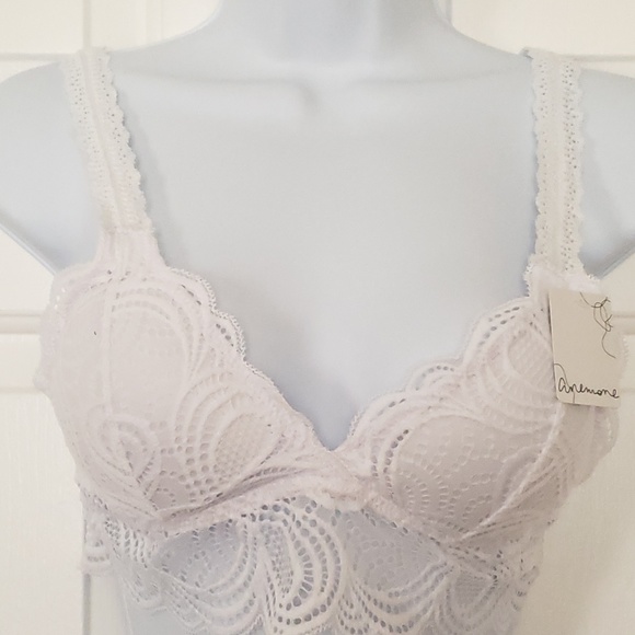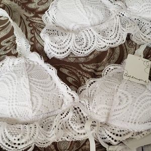 White lace Bralette, pull over style with adjustable straps, triangle cups and removable padding.