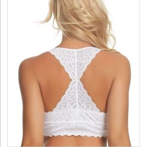 Bralette White Lace Racerback features a wide comfortable band and light mesh lining adds support. Perfect for layering.