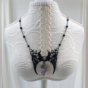 Inspired by autumn branches stripped bare, this design entwines two crescent moons w/ delicate branch motifs, crowned by a dangling raw-cut amethyst crystal arrowhead. A rare, sold-out piece that channels nature ✦ lunar cycles ✦ & witchy glamour — perfect for alt styling ✦ gifting ✦ collectors of dark fashion.