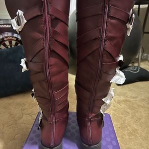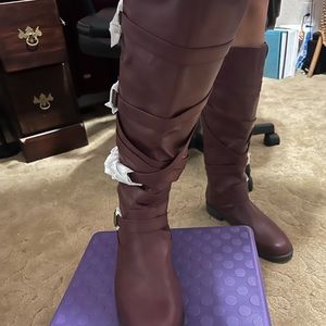 These cute boots zip up from the back which makes them unique. Plus they are a soft plum color and they have never been warn. I just hope to sell them to someone who will really appreciate how stylist they are and how comfortable they will be on their foot. I have another pair myself that I wear in a pretty light brown color and they are so comfortable. And the calf on these boots are not too wide or not too small they fit just right even in jeans
