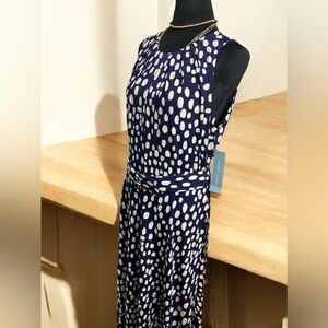 New dress, size: 8, navy blue with beige polka dots, fabric is 100% polyester