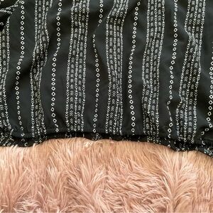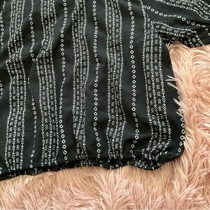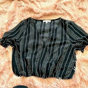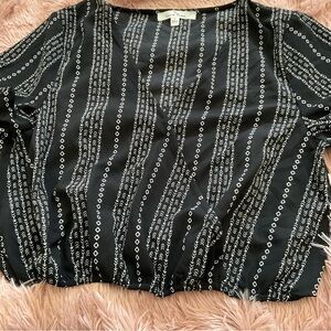 Large sized black shirt (white details/print). Fitted at the bottom. Crossed in the front. Brand - Love Tree.