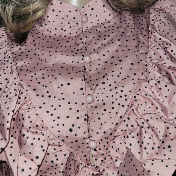 Beautiful pink and black polka-dot top perfect for work. Button up with ruffle design. Brand New!