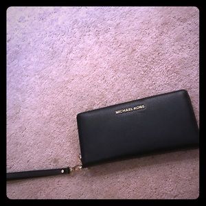 New with tag! Jet set black leather with gold lettering Michael Kors wristlet. Very sharp piece. Wallet with tons of storage attached is a wrist strap. Perfect chic piece for on the go or as a wallet !