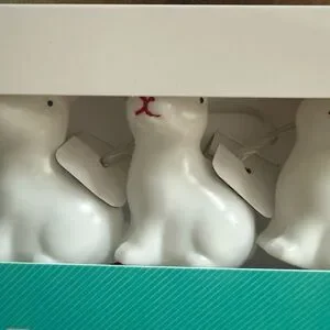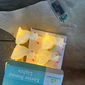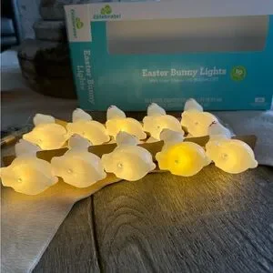 This listing is for one brand NWT Easter Bunny Lights with Timer: 6 Hours ON, 18 Hours OFF. Illuminate your party with these charming white bunny string lights. Perfect for adding a whimsical touch to any celebration. These are so adorable and I handpicked them to sell especially for you. The white bunnies have black eyes and a red nose and mouth. They look like little blow molds. There are 10 on the string. It requires 2AA batteries which is not included in sale due to post office regulations. This is a brand new item and has only been taken out of the box to take the photos for this listing. Please refer to all photos and ask any questions that you may have. All props in photos are for display only. Each measures approximately 3 1/4” tall by 2 1/4” at widest part. Lighted length 3 FT, total length 3.6 FT.