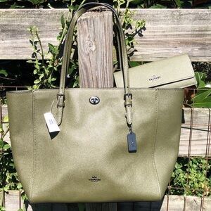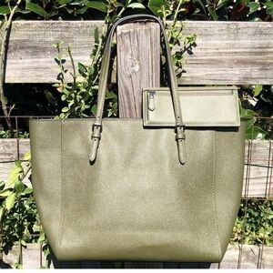 Brand new with tags! Surplus/Olive colored Large Turnlock zippered tote and matching wallet! Gorgeous and highly sought after color; sold out in stores—been stored in dust bag.