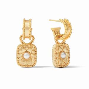 These versatile earrings feel marvelously Mediterranean, no matter how you choose to wear them. The reversible charm features a luminous mother of pearl doublet on one side, and a pearl-embellished gold plate floral design on the other.