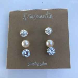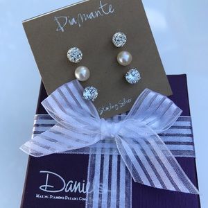New 3 pcs set of earrings Dimonte by Daniels Jewelers. MSRP $64.95. All the post are sterling silver. 1st round Crystal 6mm bead, 2nd fresh water pearls and the 3rd square cubic zirconia. These are brand new, never worn, not even to try on. I just have a bad habit of buying jewelry and never using them 😊