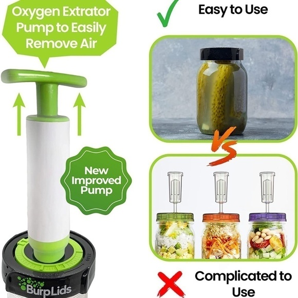 ✅ Burping Made Easy - No more frustrating time consuming untwisting and prying off lids. Use the oxygen extractor pump to burp the jar. Simply place, pump, press, done!
