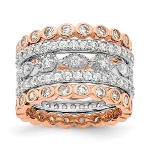 Cheryl M Sterling Silver Rhodium-plated and Rose Gold-plated Brilliant-cut CZ 5 Piece Eternity Band Ring Set is available in a size 5, 6, or 8. Total band width is 13.2mm. Comes with gift pouch.