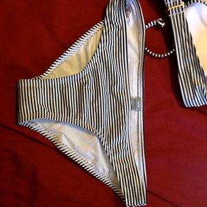 Brand New Aerie Navy and White Ruffled Bikini Set with Matching top and bottom! Top: Lightly Lined. Size 36 C. Removable straps so can be worn strapless or with straps that tie around the neck! Bottoms: x-small, regular bottoms