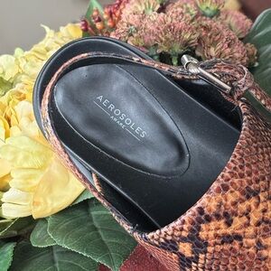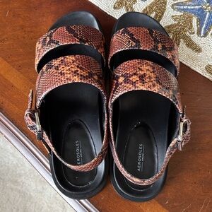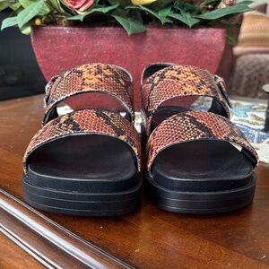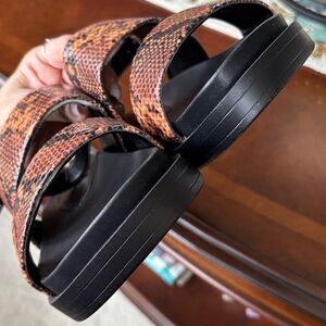 Brand New Aerosoles Leggenda Flatform Brown Snakeskin Python Print Dual Band Sandals. Slingback adjustable ankle strap.