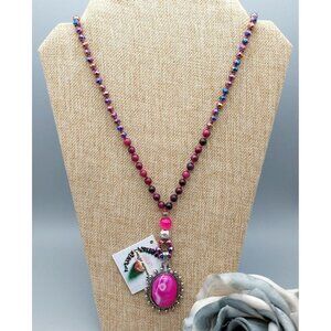 Brand New Agata Beaded Pendant Necklace Pink Purple Iridescent Oval Stone 17"