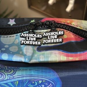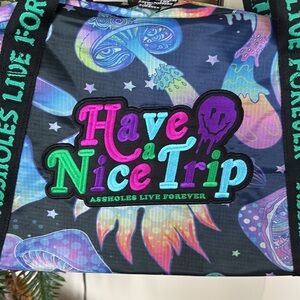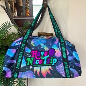 Brand New Assholes Live Forever Colorful Mushroom Psychedelic Travel Duffle Weekender Bag. Has handles and crossbody strap for easy carry.