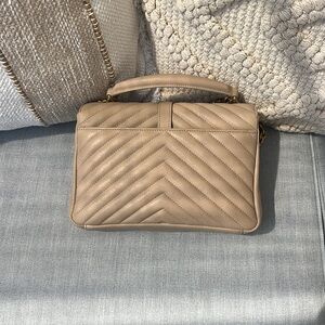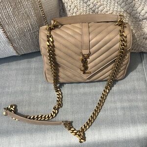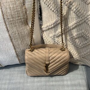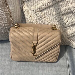 Authentic Saint Laurent Quilted Medium Shoulder Bag. This elegant piece features a luxurious quilted design, perfect for any occasion. Dark beige. Comes with detachable gold chain and dust bag. Does not come out box. Brand new, never used. Size: 6.7"H x 9.5"W x 2.6"D.
