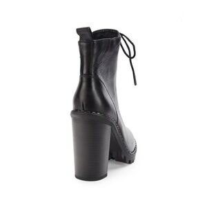 Lug sole leather lace up bootie with ball chain detail. Adjustable laces. Outsole with stacked block heel. Padded insole with memory foam and latex for all day comfort. Flexible outsole.
