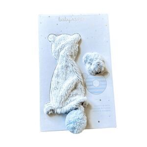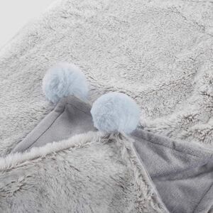 Blanket has one side of high-pile velour, and one side of low-pile in light gray. Light blue pom-pom accents are located on each blanket corner. Rattle features a gray teddy bear on top with a white and blue stripe circle body in knit. Blanket is machine washable, while rattle must be hand-washed.