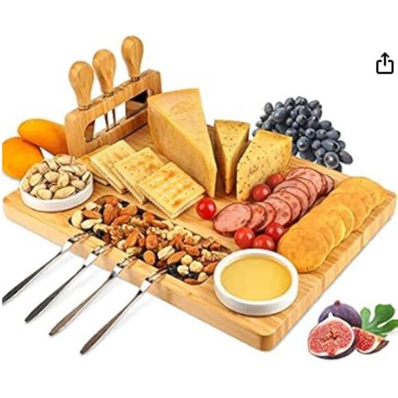 Brand New Bamboo Cheese Board Set with 3 Stainless Steel Knives and Dip Trays
