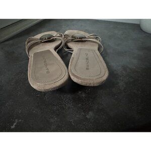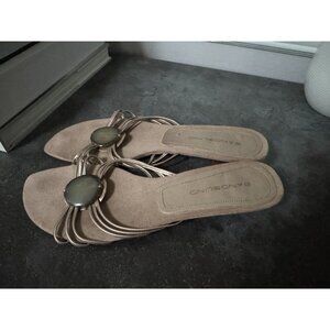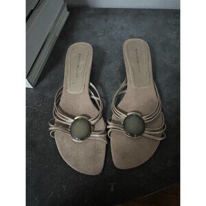Gold strappy leather sandals with greenish / yellowish stone with gold like sand under stone which embellishes strap. Heels is wood colored. Inside / sole is beige side/ No signs of wear, brand new without box.