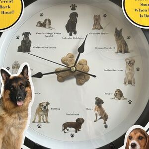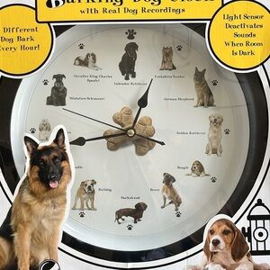 Brand New Barking Dog Clock Different Dog Bark Every Hour Popular Breeds Round. Dimensions 13.2” x 13.2” x 1.8”. Such a great unique gift for dog lovers!