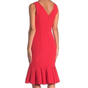 A ruffled front and hem adds sassy flair to this sleeveless V-neck dress hitting at a flattering knee length.