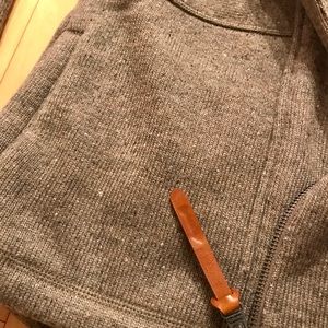 Incredibly perfect throw on and go - super cozy - brown donegal jacket. You will fall in love when you receive this! Lined in lux brushed fleece. The hood is also lined!Mid-thigh length and full zip closure or a snap close waist option. The trims are equally awesome. Faux leather tabs and faux horn toggles add the perfect amount of fashion to the trims. Side pockets with snap option so nothing falls out. I can't say enough about this jacket. Wear it with your gym gear or your fav jeans!