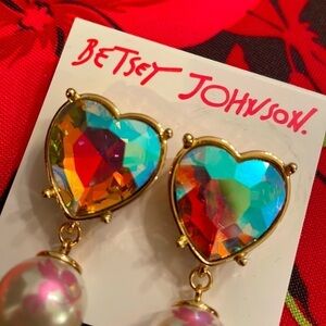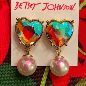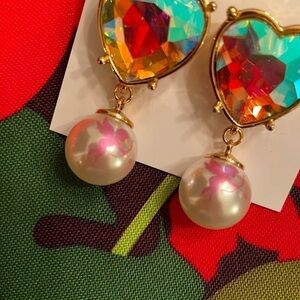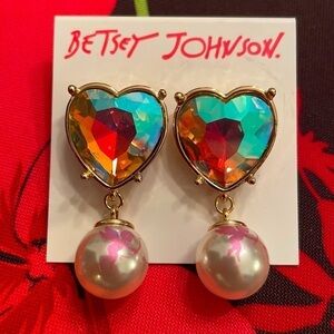 Brand New Betsey Johnson Heart Gem Cupid Cultured Pearl Drop Earrings Sparkle. So pretty & eye-catching!