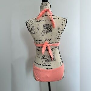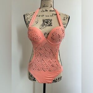 One piece with sexy cutout, pastel orange color with crystals scattered across, double padded cups for extra push up