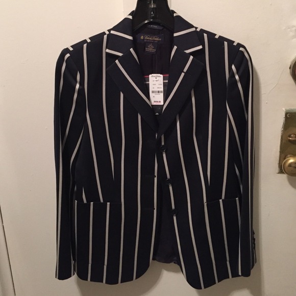 Beautiful brand new with tags blazer. Shell 100% wool, lining 100% bemberg rayon. Made in Italy. Navy with silver stripes. 3 buttons. Hot & sophisticated blazer! Originally $498, paid over $300. Reasonable offers only. I will ship fast.