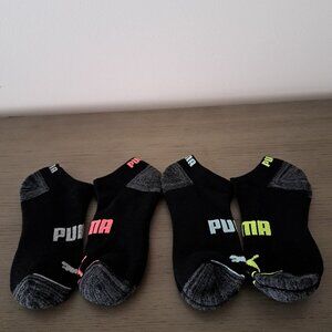 Puma Full Cushion Moisture Wicking comfort toe black socks with pink, lime, blue and grey logo. 50% Polyester | 48% Coolmax® Polyester | 2% Lycra® Spandex.