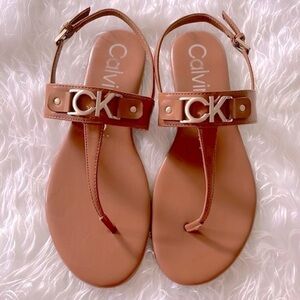 Brand New Calvin Klein Cognac Ankle Strap Thong Sandals Gold Tone Metal Logo. Women's size 9.5. No box. Great neutral, versatile shade!