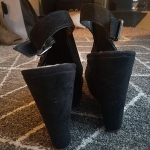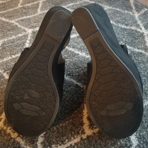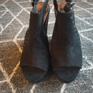 Super cute peep toe wedges that are made out of all man made materials. The wedge is about 5.5" tall but they're easier to walk in than most wedges because there's a 1" platform on the front of the show and your whole foot is covered so you don't slide out of them. They also have an adjustable strap on the back so you can adjust the shoe to fit perfectly so you can wear them comfortably all day or night.