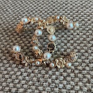 Elevate your accessory collection with the timeless elegance of this classic Chanel CC brooch. Adorned with crystals and pearls that catch the light beautifully, this gold pin showcases the iconic design synonymous with luxury and style. The intricate craftsmanship reflects the brand's commitment to quality, making it a standout piece. Whether it's to accentuate a lapel on a formal outfit or to add a touch of glamour to a scarf, this brooch promises to be a versatile addition to any wardrobe. Measurements: : 2” x 1.5”