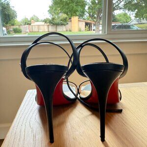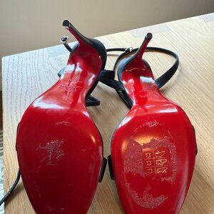 Unfortunately I had a back injury and can no longer wear heels like this. These have never been worn, you can still see the sticker residue on the bottom. Loubigirl 100 MM strappy sandal in black, size 39. Full Price is $845