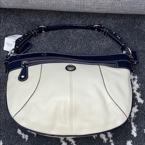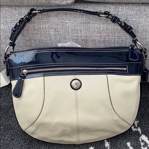 Brand New with tags Coach Purse. Never worn, no flaws. Cream leather body with navy patent leather top. Pretty bright pink interior lining.