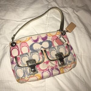 Carried one time. Perfect condition and includes longer strap. Pastel fabric.
